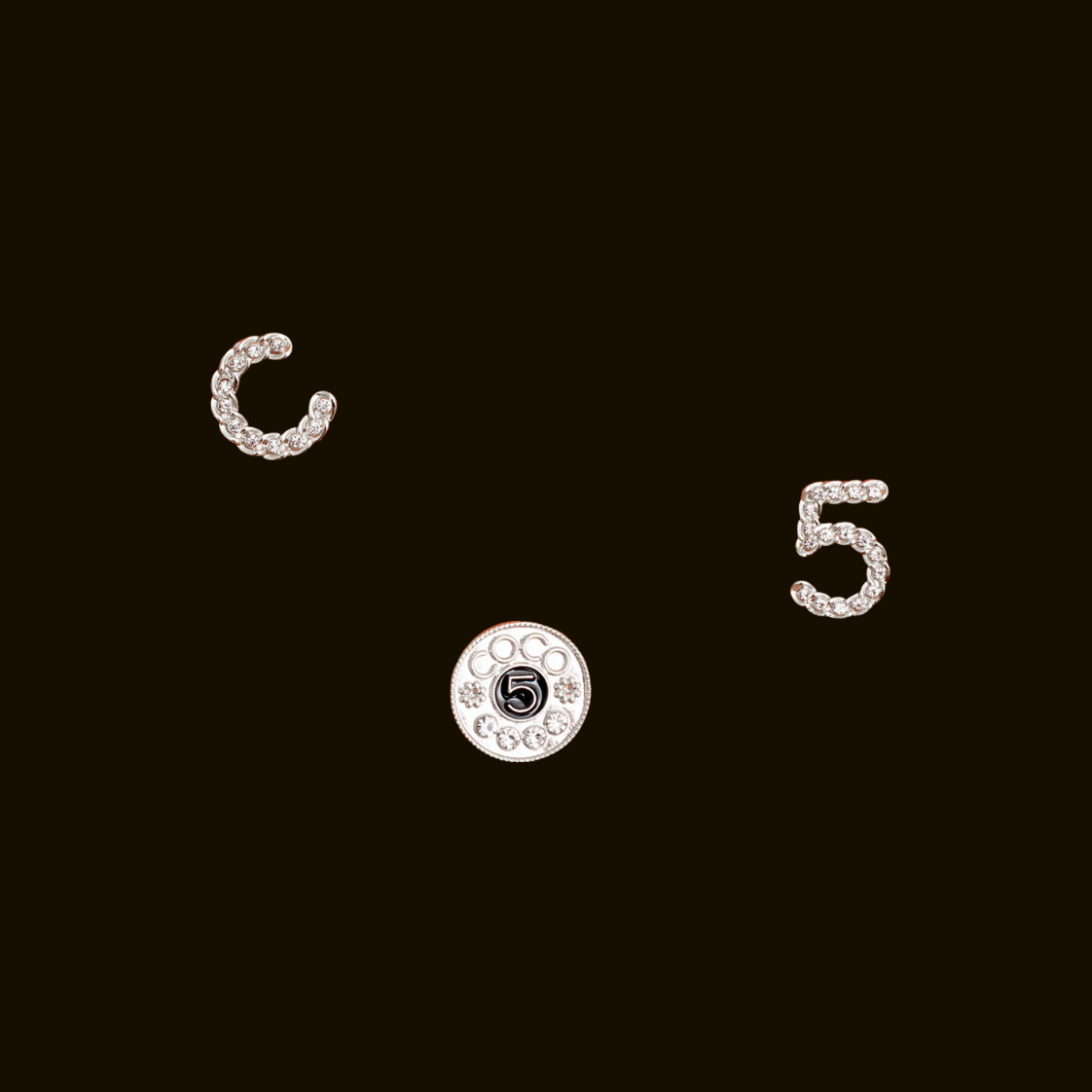 3 Pcs Designer Inspired Silver Metal and Rhinestone Stud Earring Set. Set Includes: 1" C Chain Rhinestone Studs. 1" 5 Chain Rhinestone Studs. 1" Round Coco 5 Black Epoxy and Rhinestone Studs.