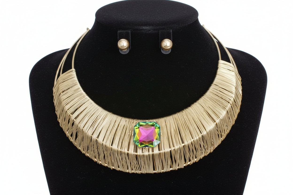 Women's Choker Necklace Set. Rigid Wide Gold Metal 3 Row Armor Style Choker Featuring Wire Wrapped Detailing and Center Mixed...