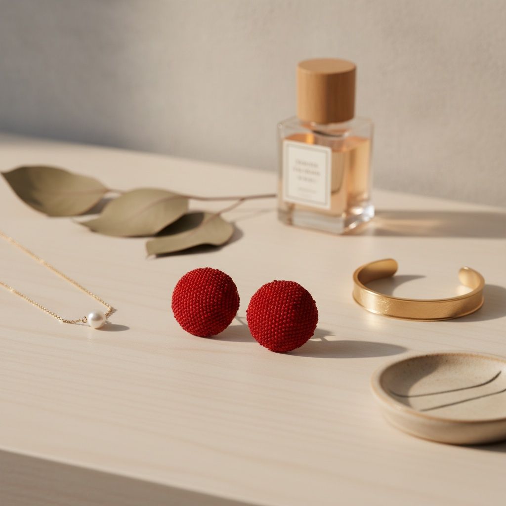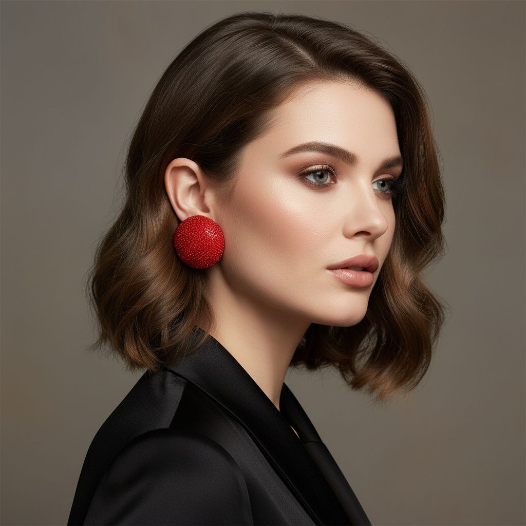 Women's Clip-On Earrings. Maximum Sparkle Statement Earrings. Bold Hollow Gold Metal Oversized Domed Clip-On Earrings Encrusted with Shimmering Red Rhinestones....