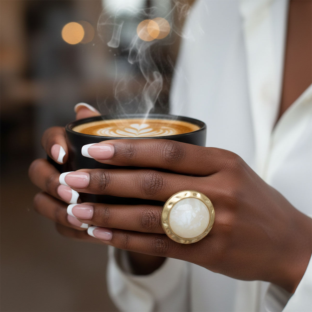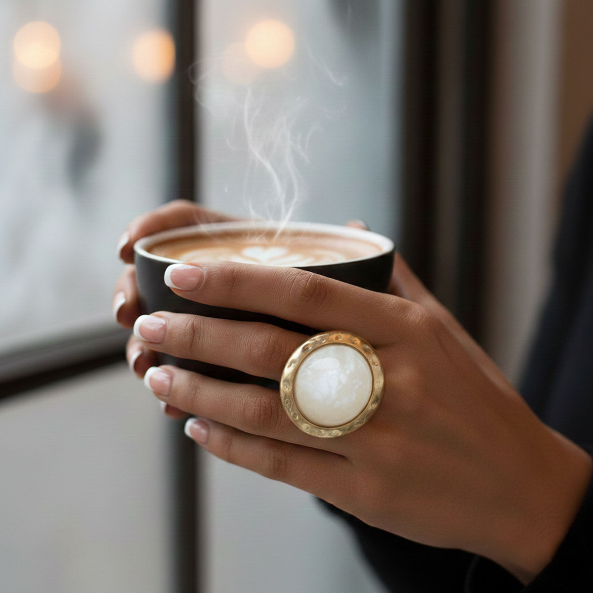 Women's Cocktail Ring. Style Statement Large Domed Round Marbled White Resin Cocktail Ring with Matte Gold Hammered Metal Edge. Stretch...