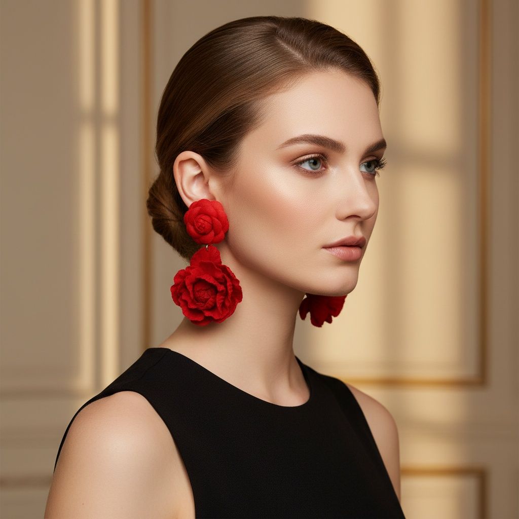 Women's Drop Earrings. Lightweight, Vibrant and Playful Drop Earrings Featuring Two Roses with Layered Red Felt Fabric Petals and Dimensional...