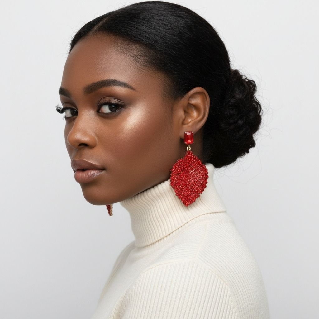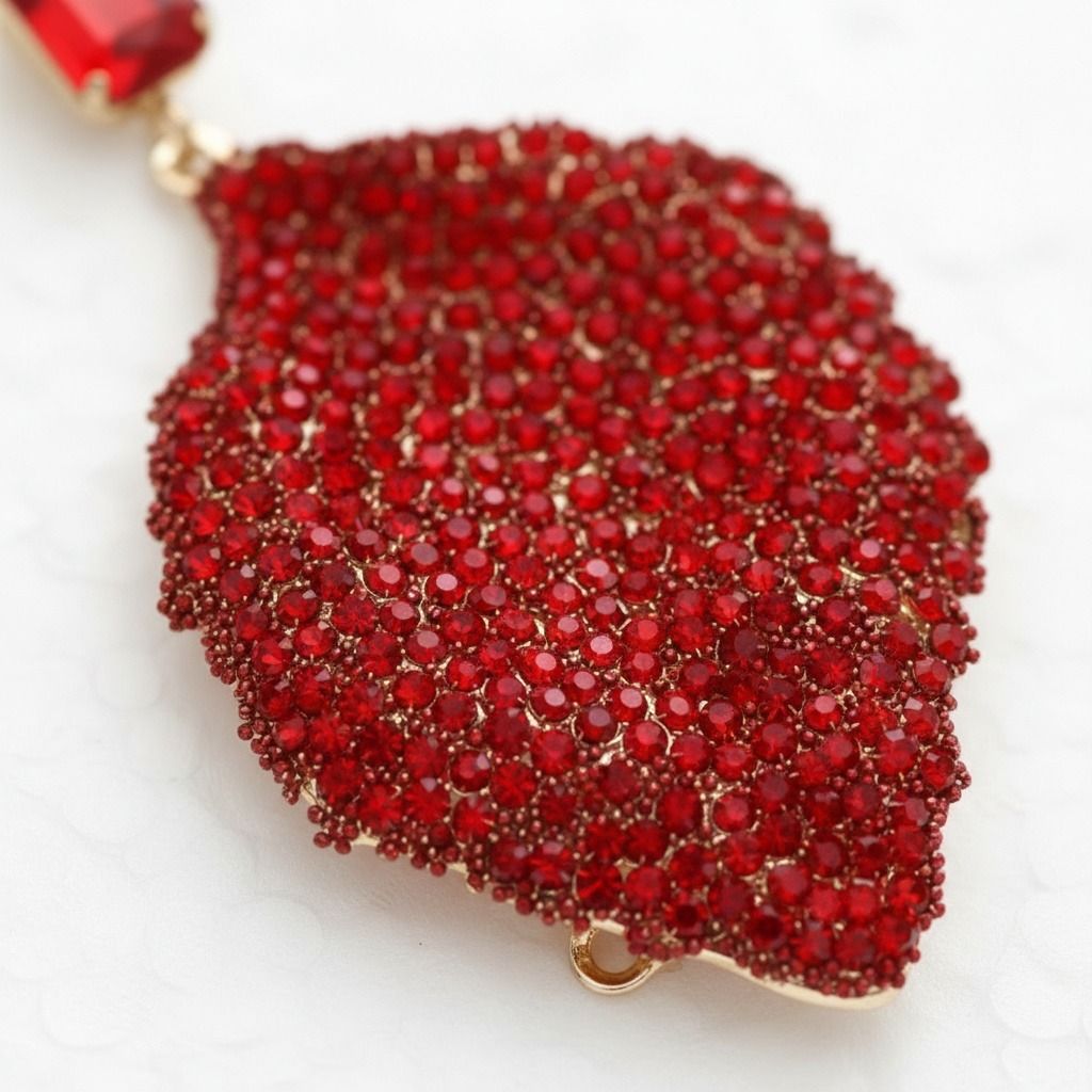 Drop Red Rhinestone Encrusted Leaf Earrings