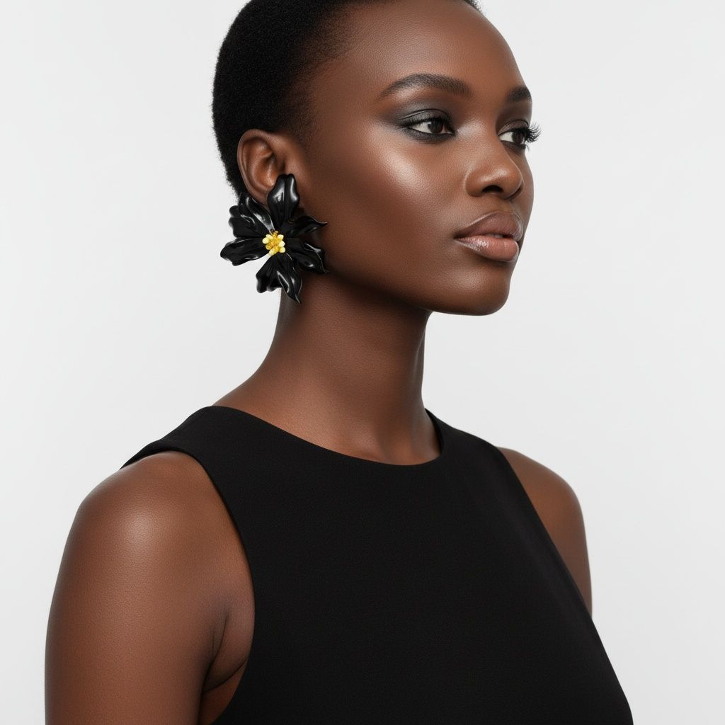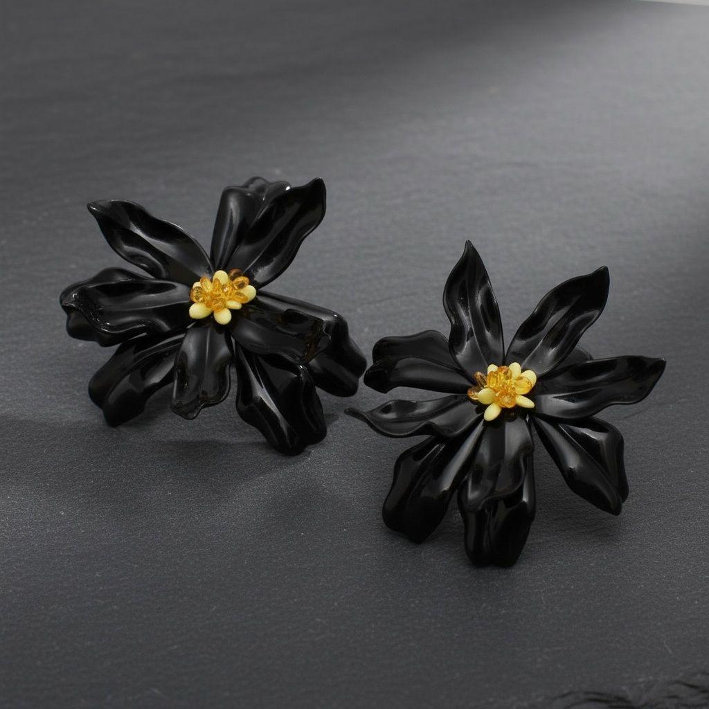 Women's Stud Earrings. Floral Statement Oversized Stud Earrings Featuring Large Dimensional Wavy Acrylic Petals in Bold Black with an Orange...
