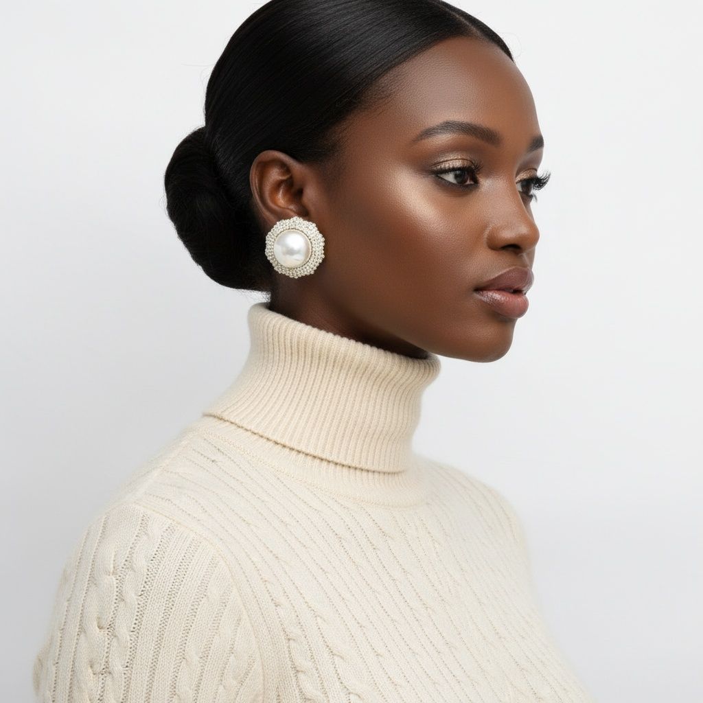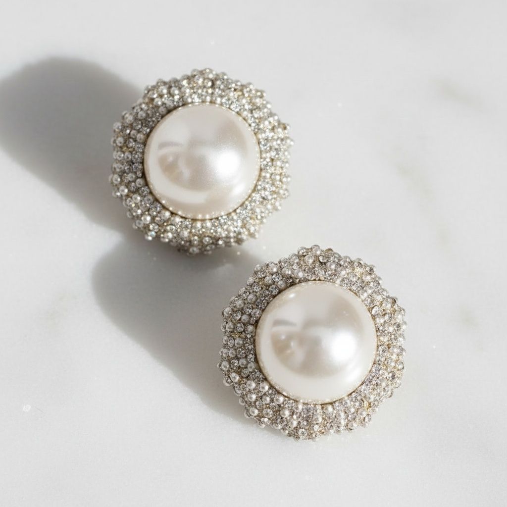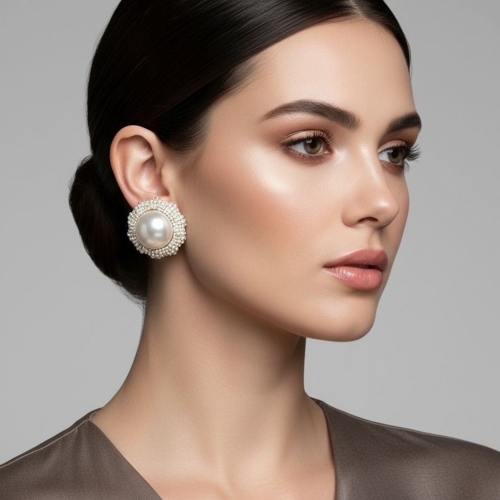 Women's Stud Earrings. Elegant and Classy Sparkle Statement Earrings. Gold Metal Wreath Shaped Stud Earrings Encrusted with Cream Pearls and...