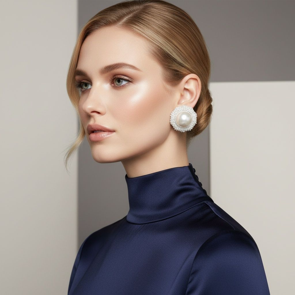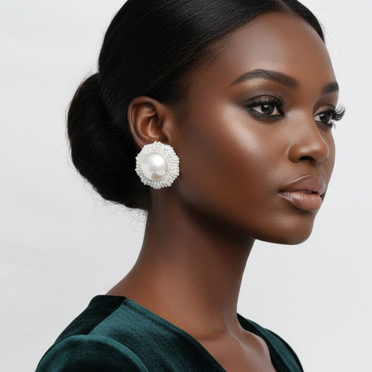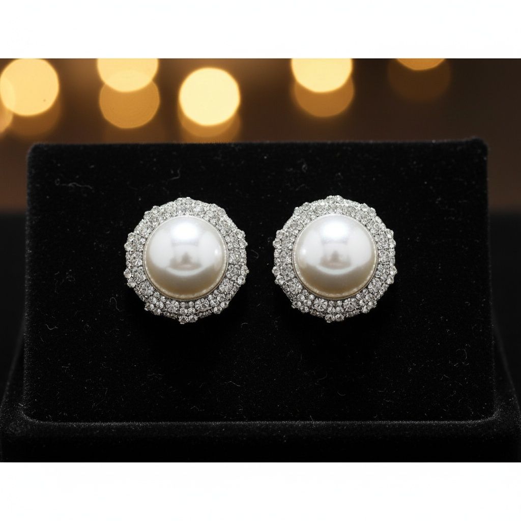 Women's Stud Earrings. Elegant and Classy Sparkle Statement Earrings. Silver Metal Wreath Shaped Stud Earrings Encrusted with White Pearls and...